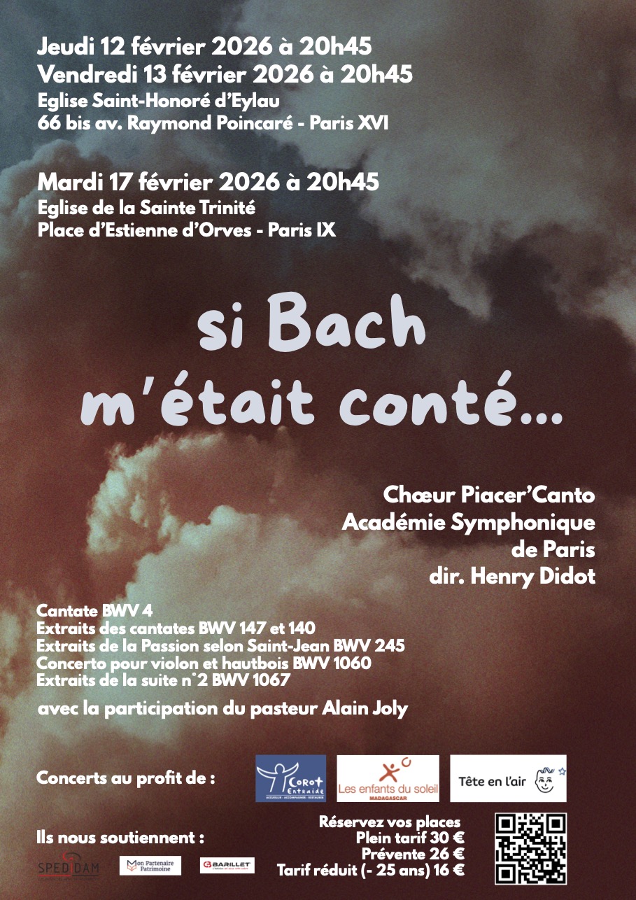 Vendredi 17 février à 20H45, le chœur Piacer’Canto dirigé par Henry Didot, interprètera un florilège de pièces de Bach dont la Cantate n°4, au profit de trois associations caritatives : Corot Entraide, Les enfants du soleil et Tête en l’Air. Le pasteur Alain Joly interviendra au cours de cette soirée.